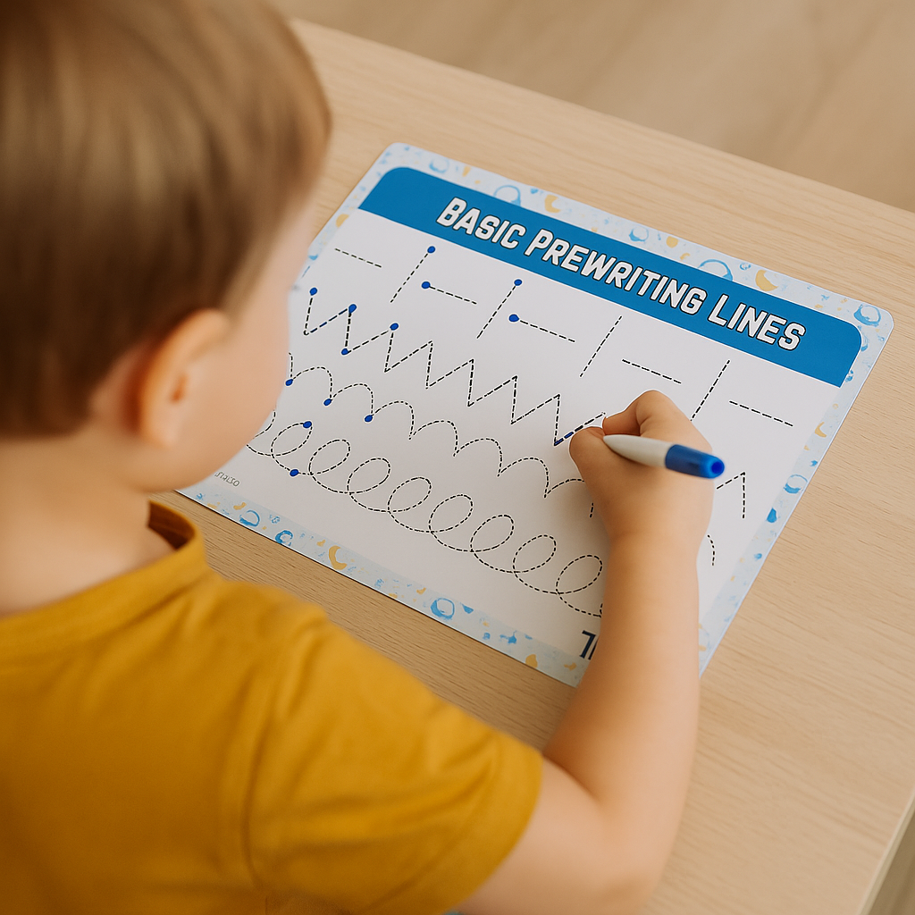 - Includes activities like prewriting lines, tracing shapes, numbers, and letters